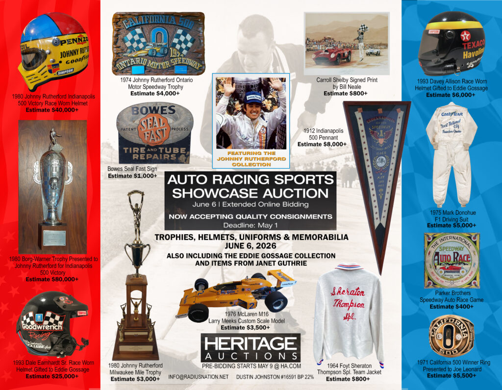 The Johnny Rutherford Collection, along with items from the Eddie Gossage, Janet Guthrie, and Kenny Schrader Collections, will be featured in the Auto Racing Sports Showcase Auction on June 6, 2026.
